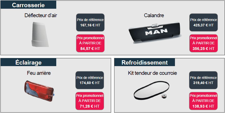 Du 1er janvier au 31 décembre 2026, promo spéciale sur les essentielles camion. Notre réseau de concessions vous propose une offre spéciale sur 180 références de pièces d’origine MAN à prix réduit. Des tarifs préférentiels pour entretenir vos poids lourds avec des composants conformes aux standards constructeur, tout en maîtrisant votre budget maintenance.